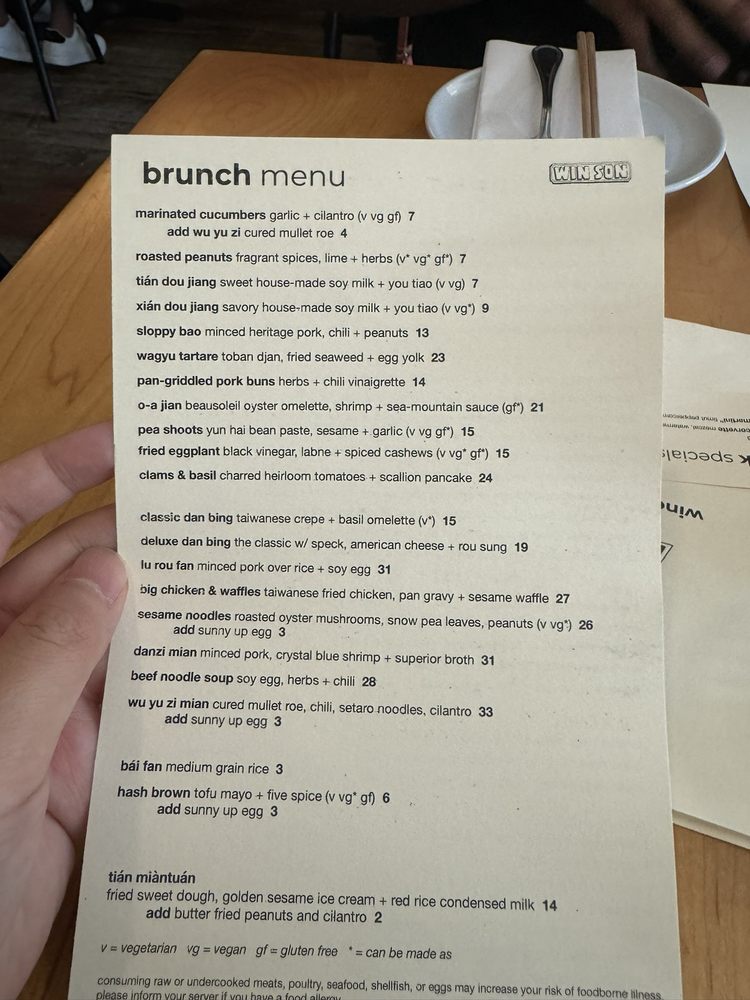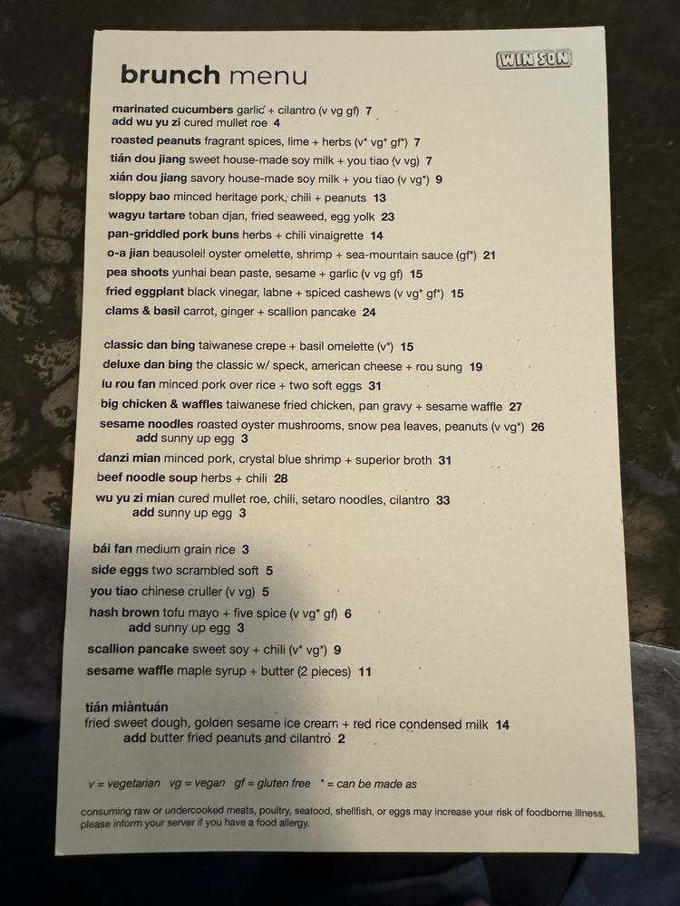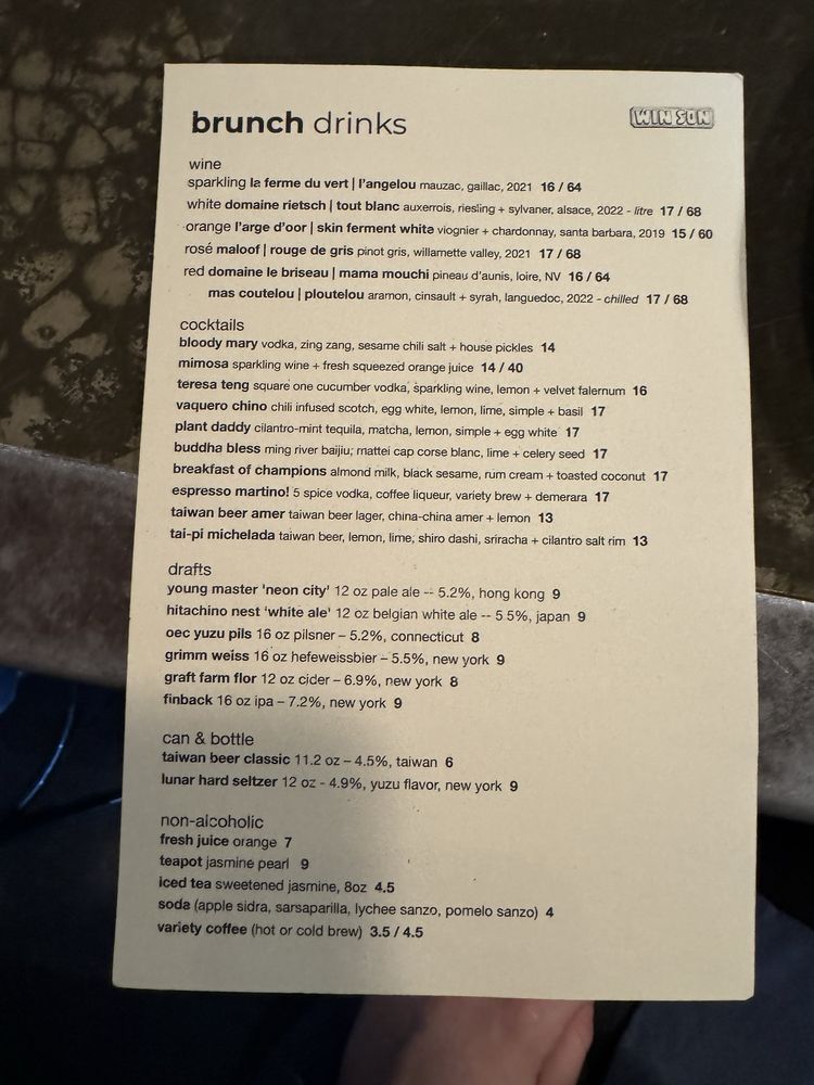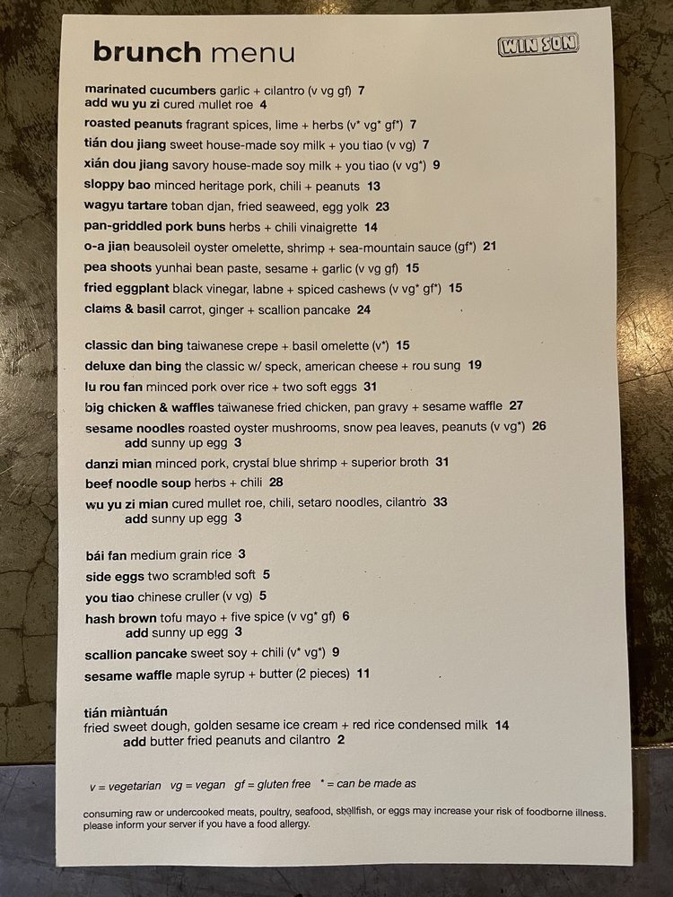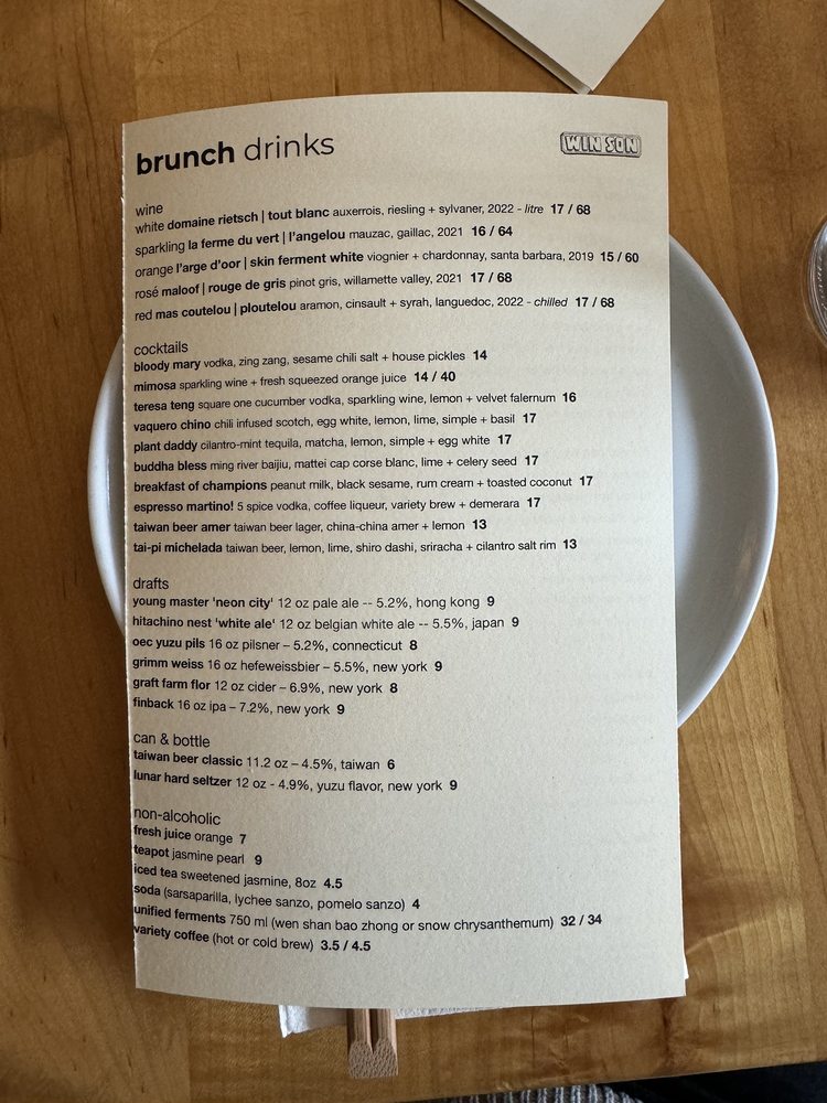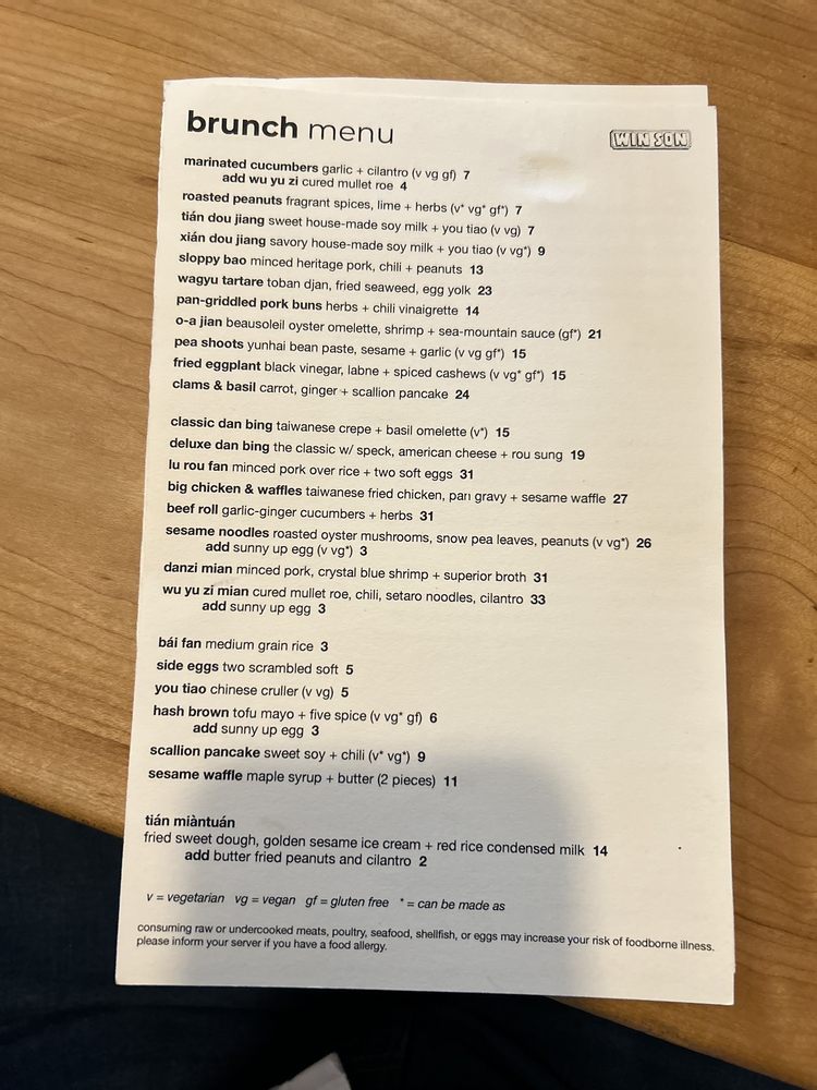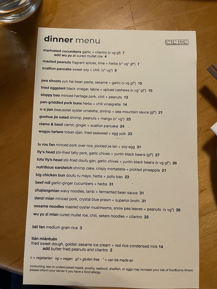 Win Son, a trendy Taiwanese fusion restaurant in Brooklyn, offers a unique dining experience with a diverse menu. The restaurant takes reservations and provides delivery and takeout options. It caters to vegan and vegetarian customers with a variety of plant-based dishes. With its modern decor and attentive waiter service, Win Son caters to a hipster and casual crowd. The menu features upscale Taiwanese-inspired cuisine, blending traditional flavors with a contemporary twist. Customer reviews praise dishes like the Big Chicken Bun, Lu Rou Fan, and marinated cucumbers for their delicious flavors and generous portions. The restaurant's dedication to quality and creativity shines through in dishes like the mullet roe noodles and vegetarian sesame noodles. Win Son's welcoming atmosphere and innovative fare make it a must-visit spot for food enthusiasts.